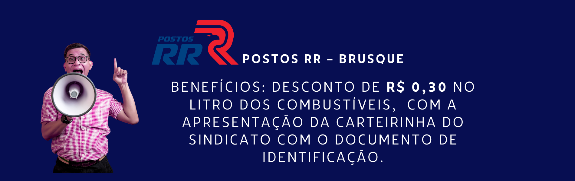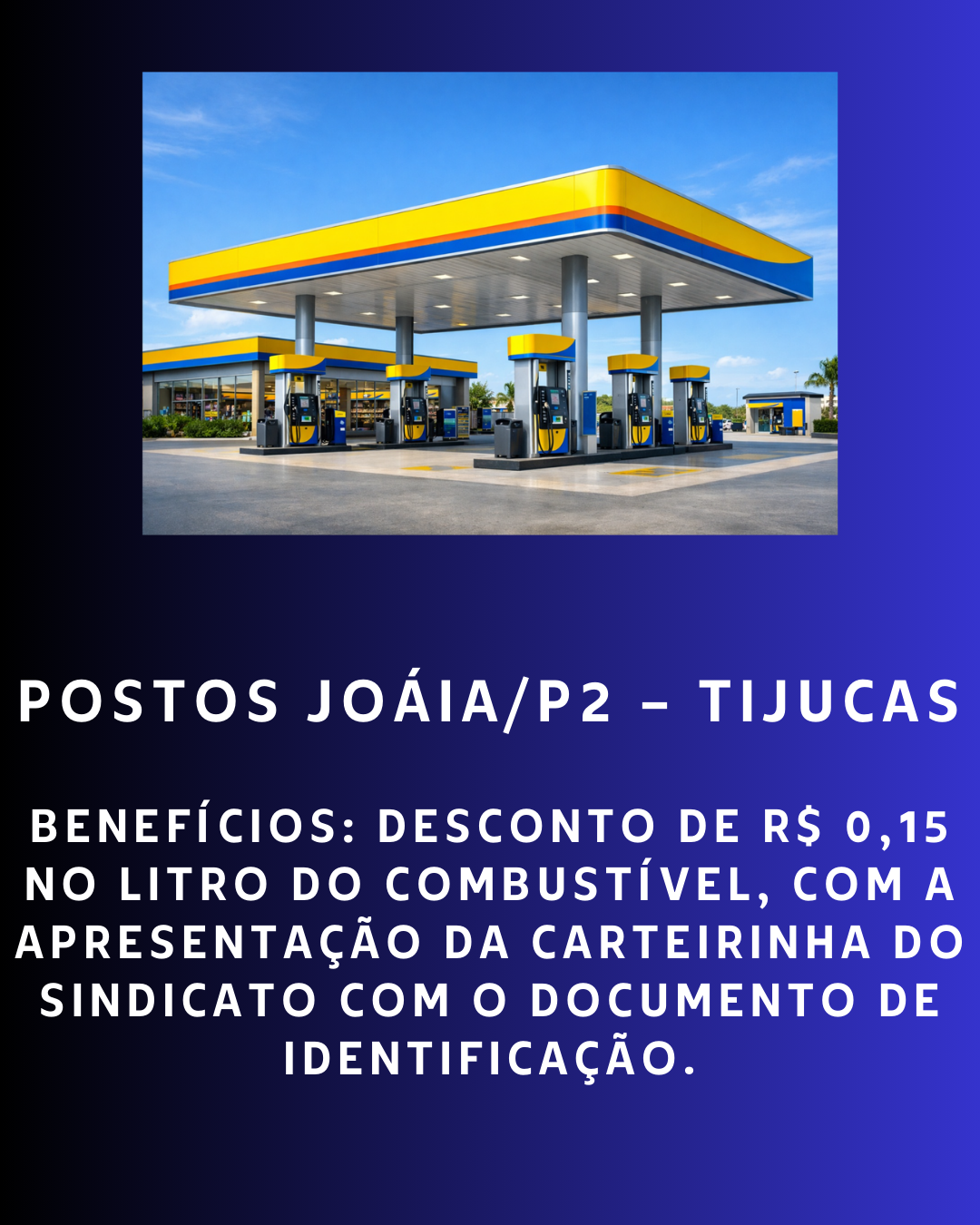 Benefícios: Desconto de R$ 0,30 no litro do combustível, com a apresentação da carteirinha do sindicato com o documento de identificação.