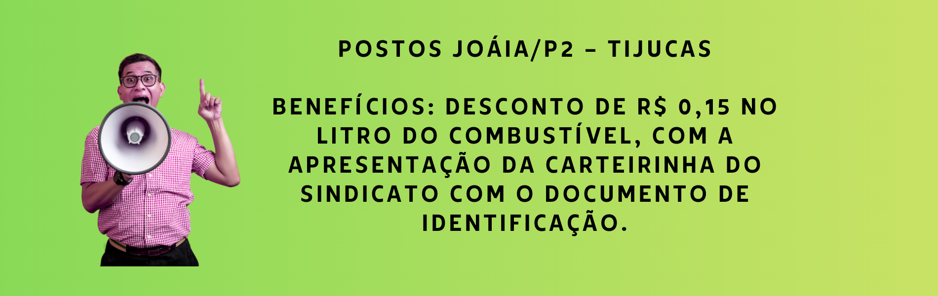 Benefícios: Desconto de R$ 0,15 no litro do combustível, com a apresentação da carteirinha do sindicato com o documento de identificação.