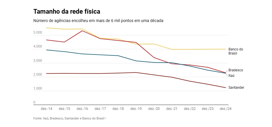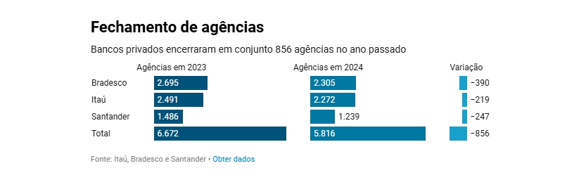 No ano passado, Itaú Unibanco, Bradesco e Santander Brasil encerraram em conjunto 856 agências, após fecharem 679 em 2023. Desde 2014, a rede dos três perdeu mais de 5 mil endereços, número que considera somente agências tradicionais. Se incluídos outros postos de atendimento, a redução é maior.
