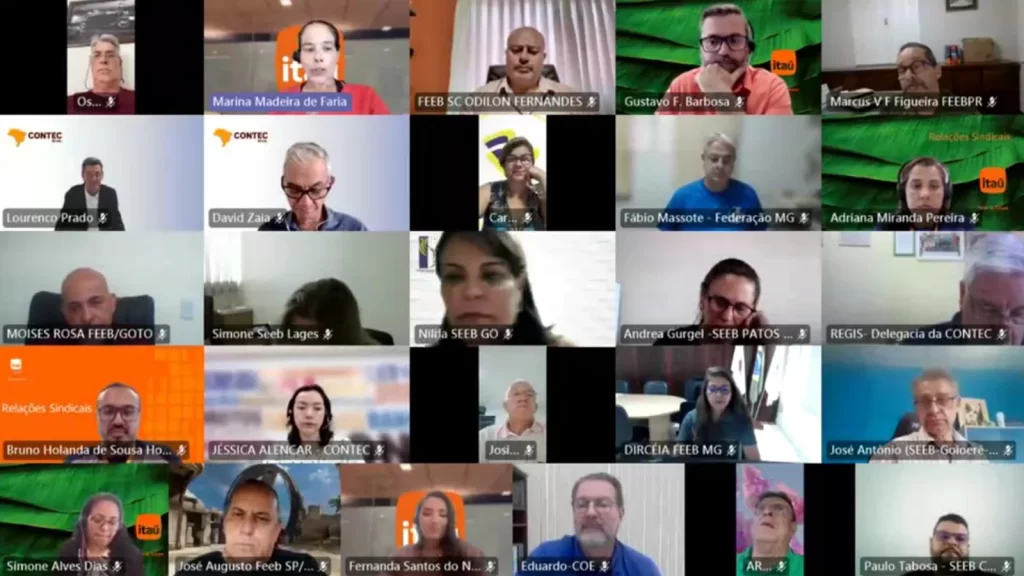 A reunião foi conduzida pelo coordenador da COE Itaú/CONTEC, Eduardo Israel, e contou com a participação do presidente da CONTEC, Lourenço Prado, do coordenador da mesa nacional, Davi Zaia, de presidentes de federações e sindicatos filiados. O banco foi representado por Marina Madeira, Gustavo Barbosa, Carlos Sobrinho, Fernanda Nascimento, Adriana Miranda, Bruno Honório e Simone Dias.